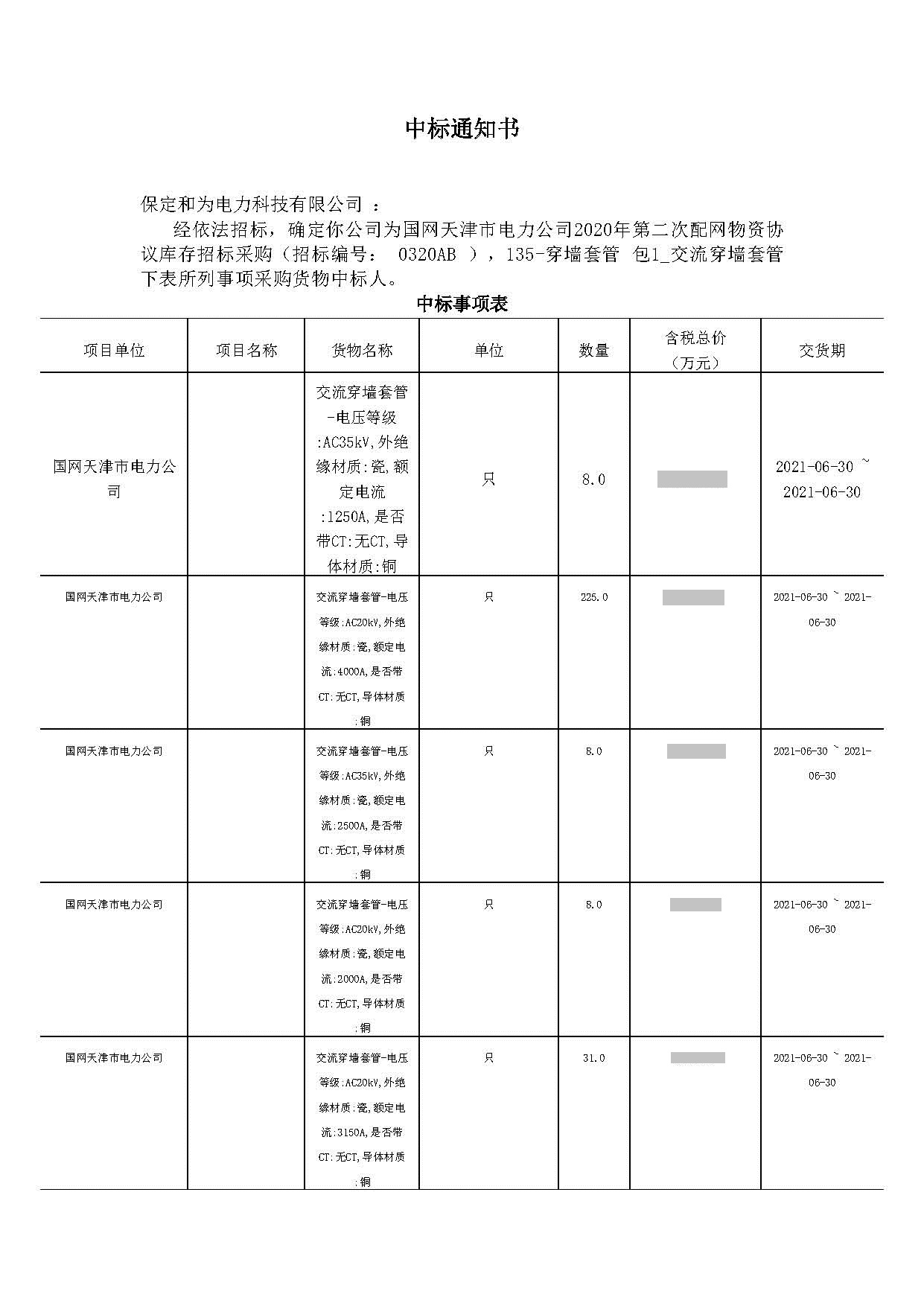2020年11月國(guó)網(wǎng)天津市電力高壓穿墻套管招標(biāo)項(xiàng)目中標(biāo)
